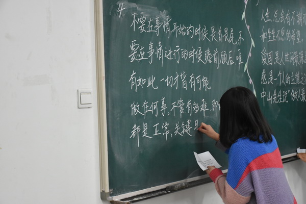304永利集团一直致力于员工全面发展,重视学风建设,开展了以就业质量提升为目的的第二课堂活动,安排专业老师为同学们练习板书、普通话、讲课技能进行指导。此次活动为同学们提供了相互切磋、展示自我的平台,加深了同学们对书法的认识和了解,提升了同学们的艺术修养和审美能力。