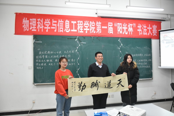 此次比赛以“展现三笔字魅力,提升物理人素质”为主题,由钢笔字帖展示与粉笔字书写两部分构成,经初选后的45名选手进入决赛。每位参赛选手需携带不少于30页硬笔字帖参赛,由评委打分后按比例计入最终成绩;粉笔字书写部分则由选手现场抽取书写内容,在限定的时间内完成作品,评委现场打分。选手们所书写的粉笔字,有的洒脱大气、有的遒劲刚毅,有的隽永飘逸,其运笔与结构都形神俱佳,显示了选手扎实的书写功底。最后,杨景振和史洪存两位老师现场书写并展示了“格物致知”“仁者不忧”的毛笔书法,可谓行云流水,磅礴大气,赢得了现场观众的热烈掌声。