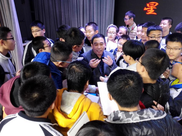 ▲崔树旺在成都石室中学作报告并与小听众合影