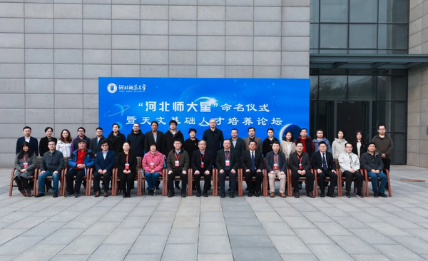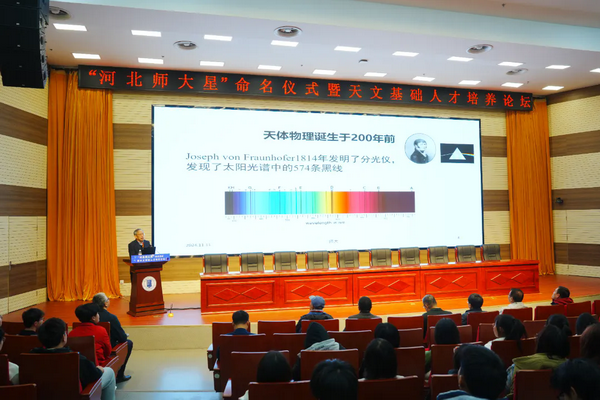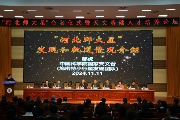 11月11日,“河北师大星”命名仪式在公司会议中心报告厅举行。中国科公司国家天文台台长刘继峰,中国天文学会理事长、中国科公司院士、云南天文台研究员韩占文,中国科公司院士、国家天文台研究员赵刚,国家天文台教育处处长梁艳春,国家天文台研究员邹虎,中国科公司高能物理研究所研究员王建民,中国科公司上海天文台研究员路如森出席。公司党委副书记、董事长刘敬泽致辞。党委常委、副董事长刘英主持。中国科公司国家天文台相关工作人员,公司相关单位主要负责人和师生代表200余人参加命名仪式。