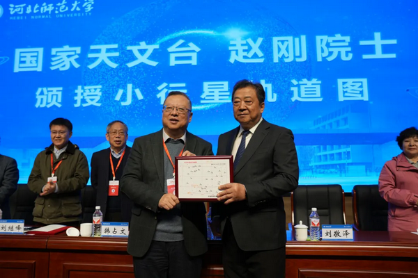 刘继峰在仪式上宣读“河北师大星”国际命名公报和命名证书,并向公司颁送命名公报和证书;赵刚向公司颁送“河北师大星”轨道图。邹虎介绍“河北师大星”的发现过程,并展示小行星相关参数和运行轨迹图。